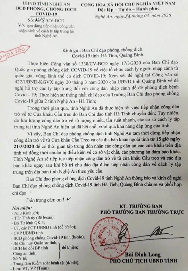 Đến chiều 21-3, ông Bùi Đình Long - Phó Chủ tịch UBND tỉnh - Phó trưởng Ban thường trực phòng, chống dịch COVID-19 tỉnh Nghệ An, ký công văn hỏa tốc gửi Ban chỉ huy phòng, chống dịch COVID-19 tỉnh Quảng Bình, Hà Tĩnh về việc tạm dừng tiếp nhận công dân nhập cảnh về cách ly tập trung tại tỉnh Nghệ An.