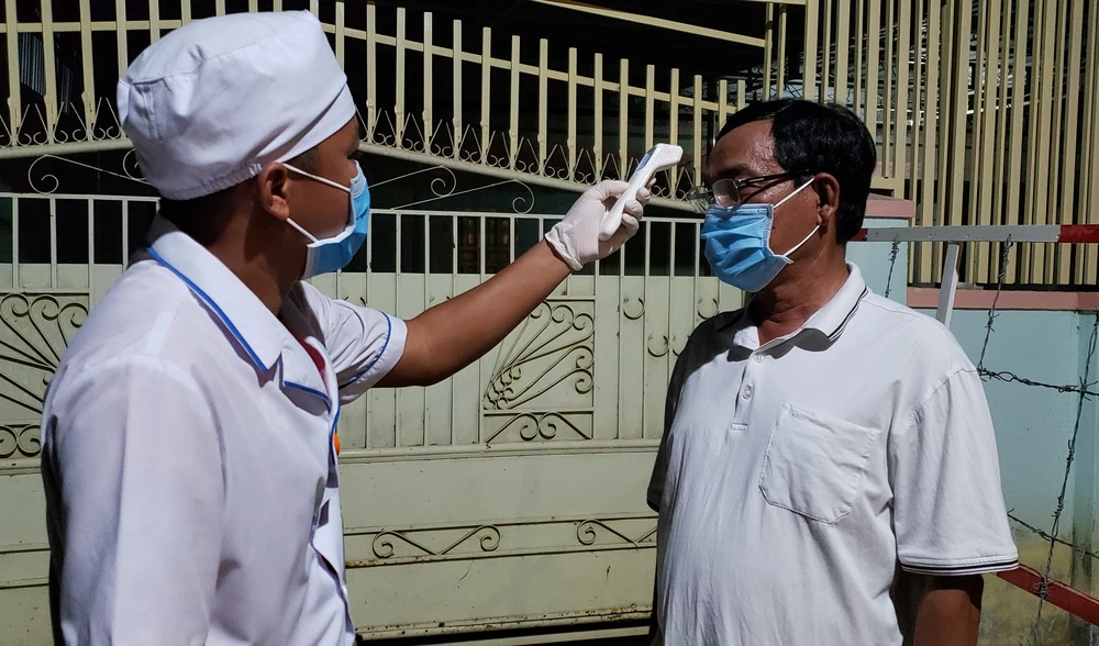 Nhân viên y tế đo thân nhiệt lực lượng chức năng làm nhiệm vụ. Ảnh: TỰ SANG