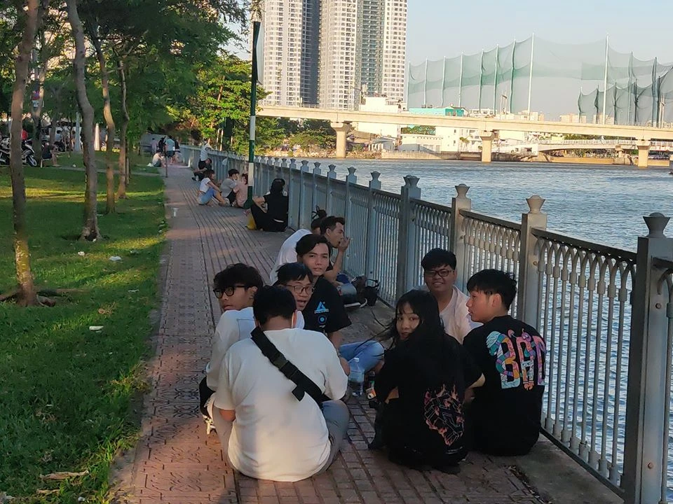 Gần hai tuần qua, ở công viên dọc bờ kè kênh Nhiêu Lộc, phía đường Trường Sa, thường xuyên có nhiều nhóm bạn trẻ tụ tập vào các buổi chiều.