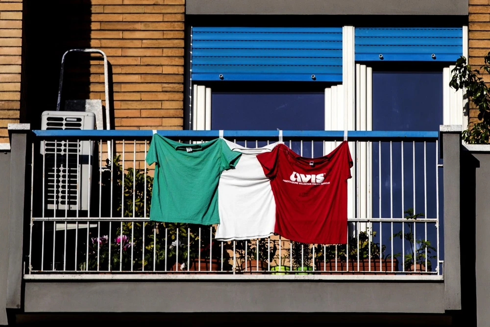 Áo thun mô phỏng màu cờ quốc gia Ý được treo trên ban công một ngôi nhà ở thủ đô Rome (Ý) ngày 16-4. Ảnh: EPA-EFE
