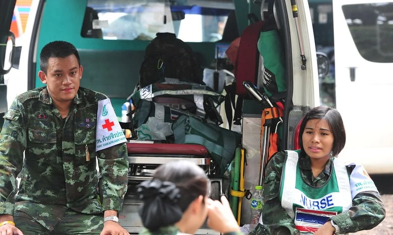 Hiện đã có 1 bác sĩ và một y tá vào đến nơi của nhóm 13. Trong hình, lực lượng y tế túc trực trước hang để đợi tin 12 cậu bé trước lúc được tìm thấy. Ảnh: AP