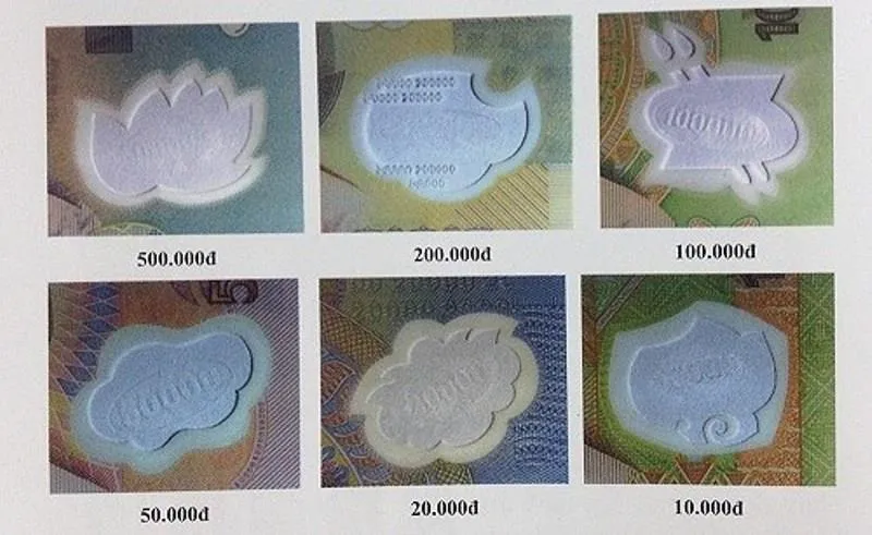 Tiền thật: Tại các vị trí có yếu tố in nổi, sẽ cảm nhận được độ nổi, nhám ráp của nét in, như: Chân dung Chủ tịch Hồ Chí Minh, Quốc huy, mệnh giá bằng số và bằng chữ, dòng chữ “CỘNG HÒA XÃ HỘI CHỦ NGHĨA VIỆT NAM”.