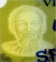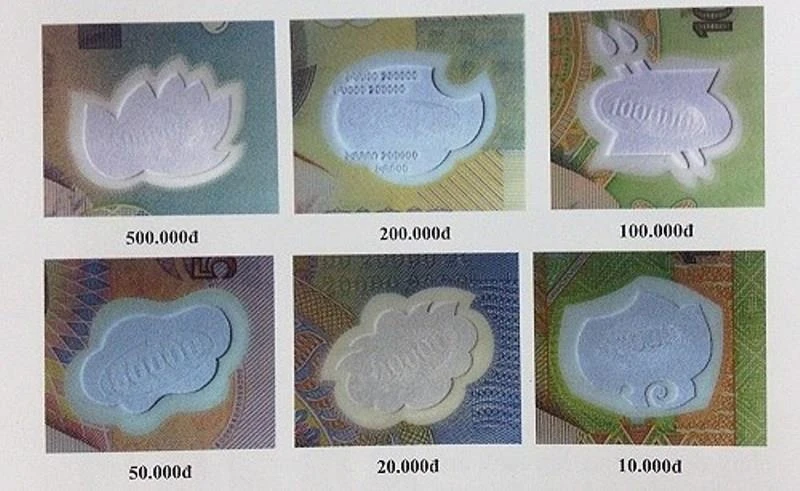 - Hình bóng chìm (bên trái mặt trước hoặc bên phải mặt sau tờ tiền): Nhìn thấy rõ từ hai mặt tờ tiền, được thể hiện bằng nhiều đường nét tinh xảo và sáng trắng. Đối với mệnh giá từ 20.000đ đến 500.000đ là hình ảnh chân dung Chủ tịch Hồ Chí Minh; mệnh giá 10.000đ là hình ảnh chùa Một Cột.