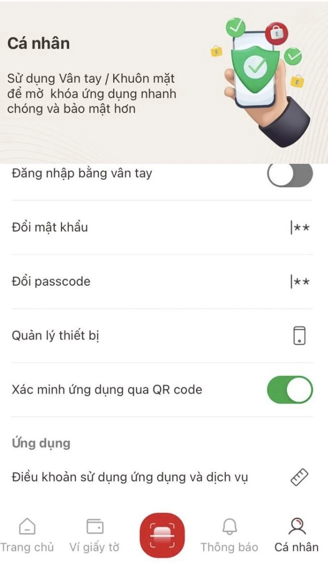 Bước 1: Đăng nhập ứng dụng VNeID bằng tài khoản định danh điện tử mức độ 2 và bật chức năng “Xác minh ứng dụng qua QR code” trong mục “Cá nhân”.