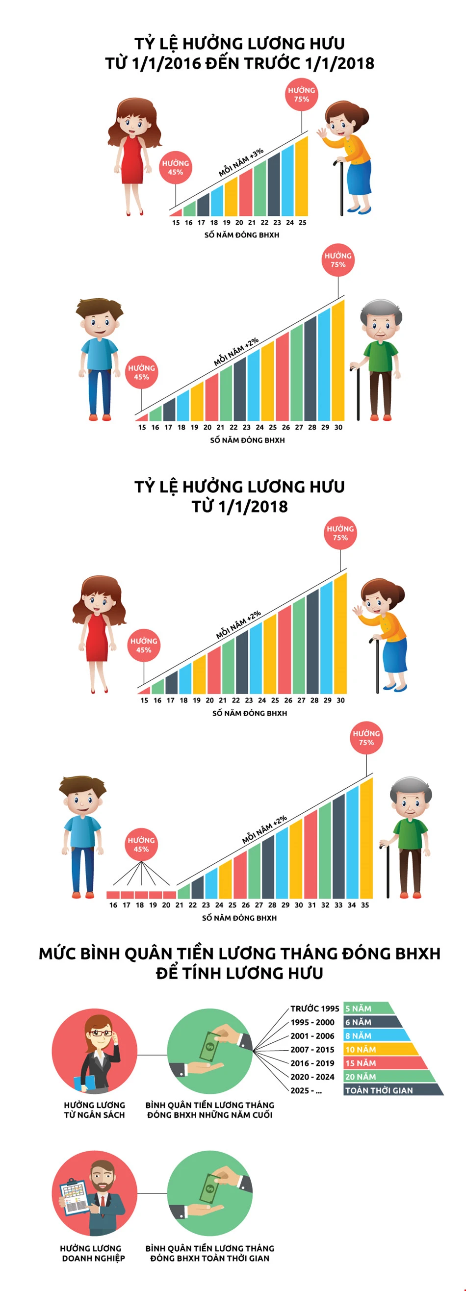 Tỷ lệ hưởng lương hưu trước và sau 1-1-2018, cùng mức bình quân tiền lương đóng BHXH. (Infographic: QUANG DUY)