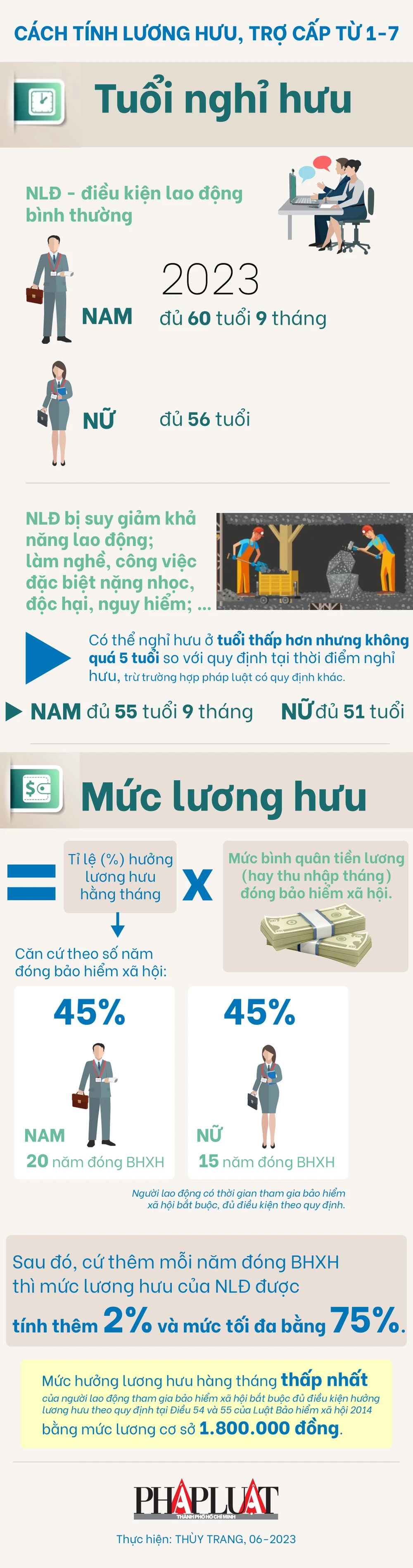 (PLO)- Từ 1-7-2023, mức lương cơ sở tăng thì mức lương hưu hàng tháng thấp nhất của nhóm lao động tham gia bảo hiểm xã hội bắt buộc sẽ tăng từ 1.490.000 đồng lên thành 1.800.000 đồng. Cụ thể cách tính mức lương hưu như sau.