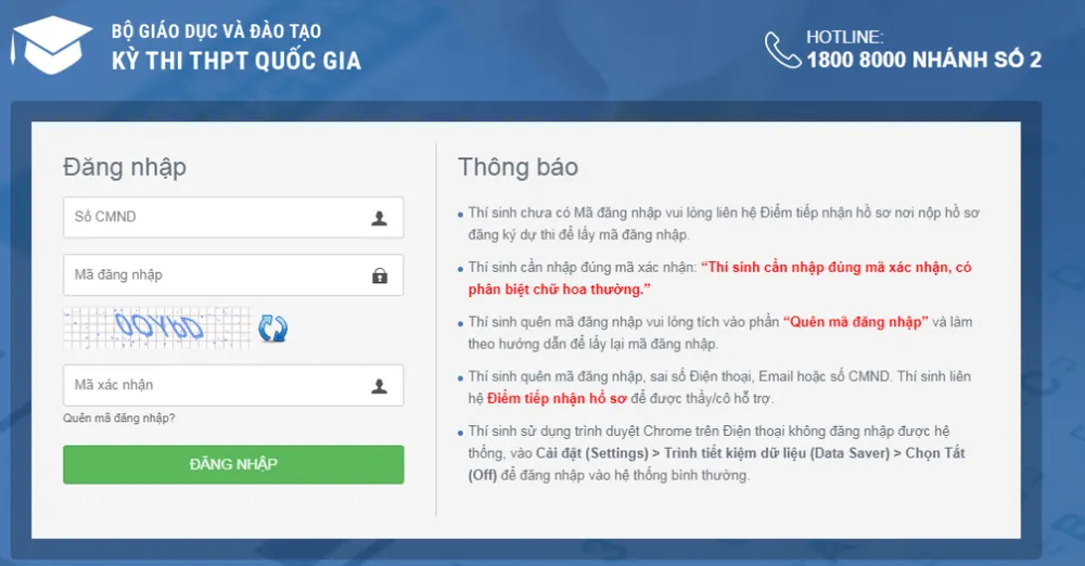 Cách thứ hai, thí sinh có thể tra cứu điểm thi theo địa chỉ website của Bộ GD&ĐT: http://thisinh.thithptquocgia.edu.vn; Thí sinh đăng nhập vào hệ thống bằng số CMND, mã đăng nhập (được cấp khi nộp hồ sơ đăng ký dự thi), và mã xác nhận (capcha) để vào tra cứu.