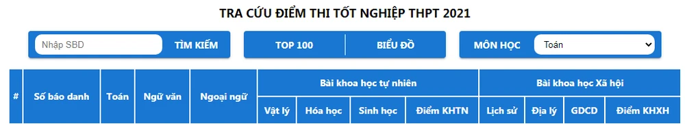 Phần mềm tra cứu sẽ hiện ra kết quả thi của thí sinh cũng như top 100 thí sinh có điểm thi cao nhất từng môn và phổ điểm của từng môn.