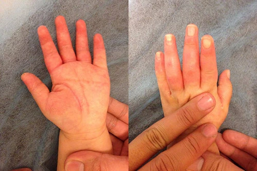 Trường hợp bé 1,5 tuổi bị bỏng nước sôi phồng rộp cả bàn tay, cha mẹ điều trị đơn giản thay băng các ngày với Nacl và Biafine, sau 2 tuần bàn tay đã xinh xắn trở lại. (ảnh do BS Nguyễn Xuân Anh cung cấp)