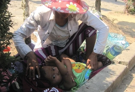 Chị Lan và đứa bé mới 2 năm tuổi cũng được chị bồng đi để ăn xin. Ảnh: V.LONG