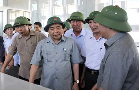 Thủ tướng Chính phủ Nguyễn Xuân Phúc kiểm tra công tác khắc phục hậu quả bão số 1 tại trạm bơm tiêu úng Cốc Thành, huyện Vụ Bản (Nam Định) ngày 31-7. Ảnh: TTXVN