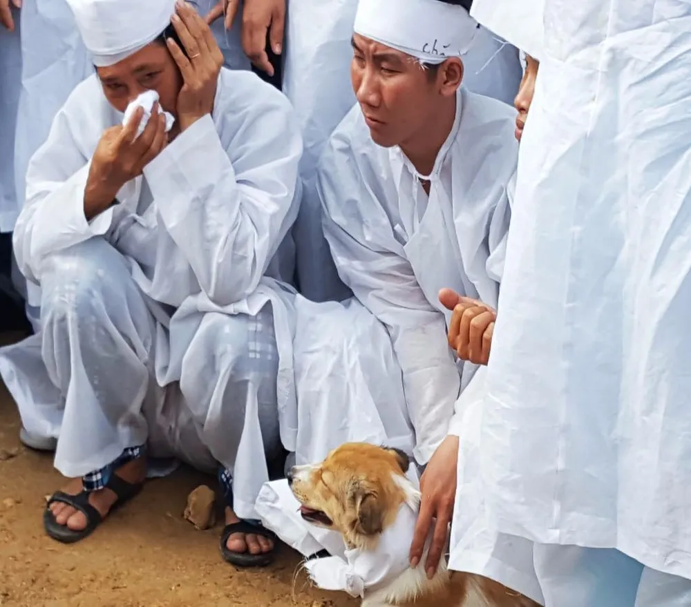 Bảy ngày trước, bà cụ qua đời. Vừa nghe tin, tôi vội vàng chạy đến. Hình ảnh đập vào mắt tôi khi đó là con chó nằm rũ xuống ngay cạnh bà. 23 giờ khuya hôm đó, khi thấy người con trai út từ Sài Gòn kịp về đến nhà trước khi khâm liệm mẹ, con chó phóng lên ôm cổ người con út. Ánh mắt nó buồn rười rượi nhưng vẫn ngoe nguẩy đuôi như có thêm người chia sẻ mất mát. Trong danh sách con cháu, bà con thân thích đưa cơ sở dịch vụ để chuẩn bị đồ tang, con chó cũng được đưa vào. Khi con cháu quỳ lạy trước bàn thờ bà cụ để chịu tang, con chó nằm quỵ trước bàn thờ và được người thân quấn lên cổ một chiếc khăn tang. Từ đó, nó nằm suốt bên cạnh quan tài bà cụ. Sợ nó đói lả, nhiều lần người thân đưa chén súp nhưng nó vẫn không ăn.