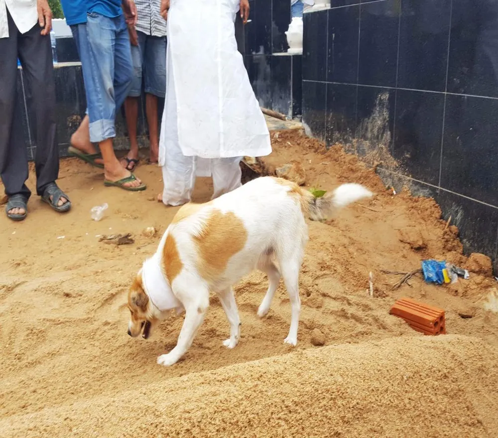 Khi hạ quan tài bà cụ xuống huyệt, con chó nằm khuỵu xuống, ánh mắt buồn não nề.