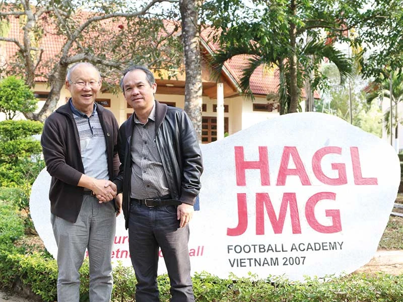 Bầu Đức và HLV Park Hang-seo tại Trung tâm Hàm Rồng HA Gia Lai. Ảnh: PEN