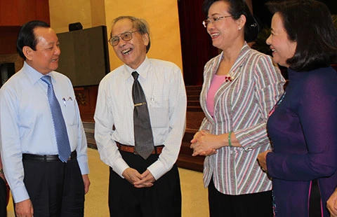Bí thư Thành ủy Lê Thanh Hải (bìa trái) đang trao đổi với các đại biểu tham dự buổi tọa đàm sáng 13-12. Ảnh: tá lâm