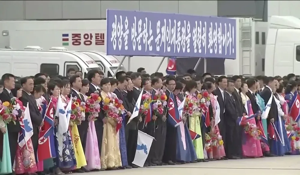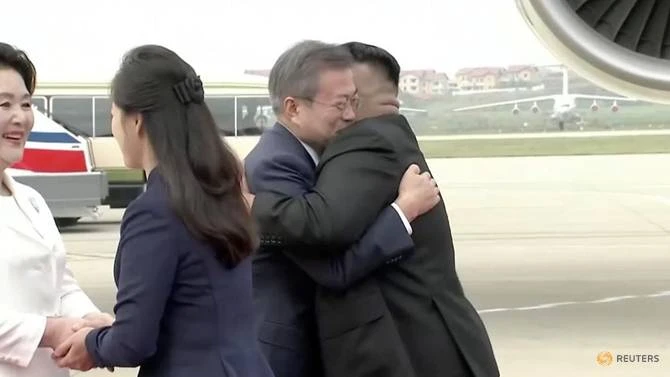Gặp nhau tại sân bay, ông Moon và ông Kim nở nụ cười, bắt tay và ôm nhau trong khi Đệ nhất phu nhân Triều Tiên Ri Sol-ju tiếp đón Đệ nhất phu nhân Hàn Quốc Kim Jung-sook. Người dân Triều Tiên cũng mang theo cờ, hoa chào mừng Tổng thống Hàn Quốc.