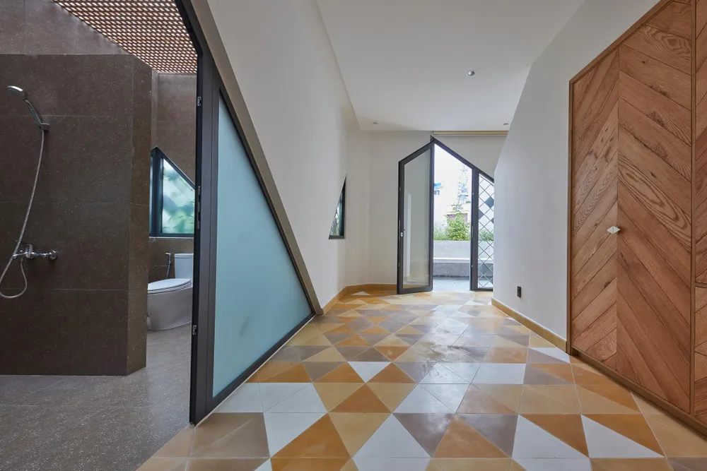 Vật liệu ốp lát cũng cùng họa tiết tam giác tạo thành một tổng thể thống nhất.