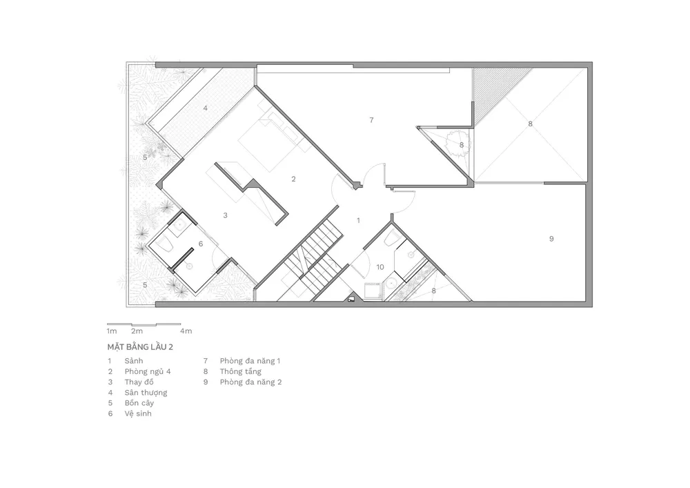 Căn nhà cũ và chia quá nhiều phòng ốc thừa thãi nên kiến trúc sư chọn cách chia mới là những hình tam giác cắt xéo qua mặt bằng cũ.