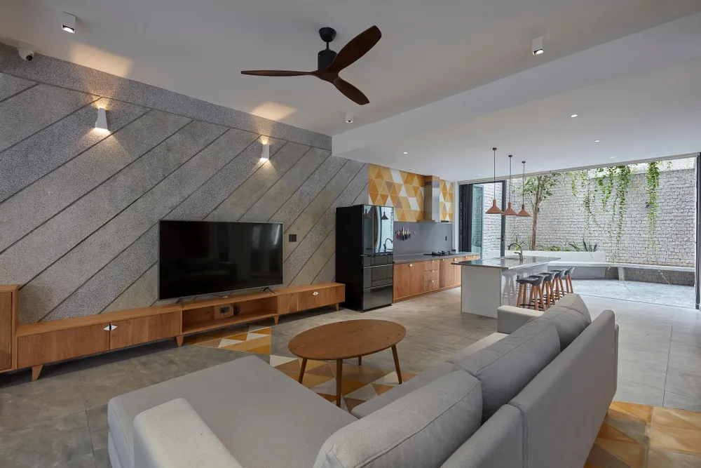 Kết hợp chất liệu trên là đá mài đá rửa, các vân gỗ xéo và bông gió họa tiết tam giác làm nên sự thống nhất và thô mộc có nét đặc trưng riêng cho phần nội-ngoại thất.
