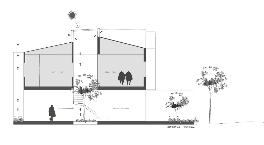 Khi tiếp cận với công trình cải tạo, KTS T H I A architecture cho biết: “Chúng tôi nhận thấy ngôi nhà thiếu ánh sáng và thông gió cũng như việc bài trí các chức năng ở trong ngôi nhà chưa khai thác được yếu tố tự nhiên. Chúng tôi mạnh dạn cắt ngôi nhà ra thành hai khu với các chức năng (hai hình hộp chữ nhật), kết nối hai khu bằng "cây cầu" và khoảng thông tầng lớn."