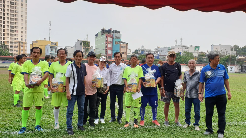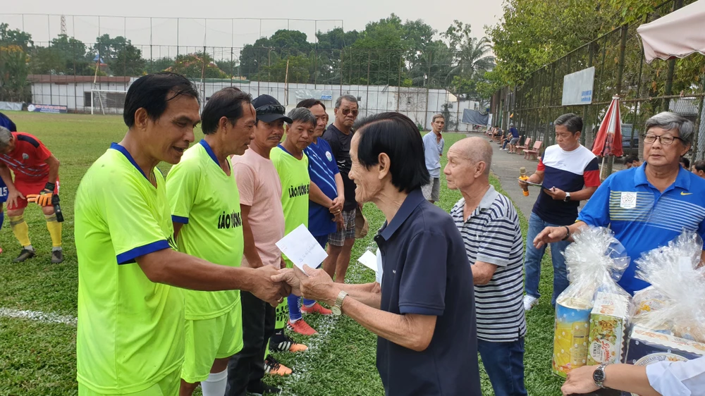 Phó Tổng biên tập báo Pháp Luật TP.HCM Nguyễn Đức Hiển và Chi hội trưởng Hội Cựu cầu thủ TP.HCM Hồ Nguyễn trao qua đến các cựu cầu thủ. Ảnh: PV