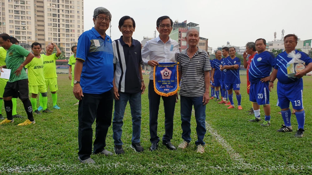 Phó Tổng biên tập báo Pháp Luật TP.HCM nhận cờ lưu niệm từ Chi hội Cựu cầu thủ TP.HCM. Ảnh: PV