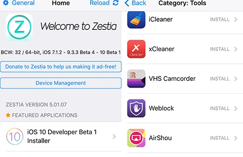 Để cài đặt kho ứng dụng Zestia, đầu tiên bạn hãy mở trình duyệt Safari và nhập vào địa chỉ http://goo.gl/n9SlXS và cài đặt. Giao diện của Zestia khá đơn giản, các ứng dụng đều được phân chia thành từng mục gồm Tweaks, Tools (chặn quảng cáo, tải video, quay phim màn hình...), Photo Editing (chỉnh sửa ảnh) hay Hacked Games (những trò chơi đã được hack đầy đủ vật dụng) và rất nhiều thể loại khác.