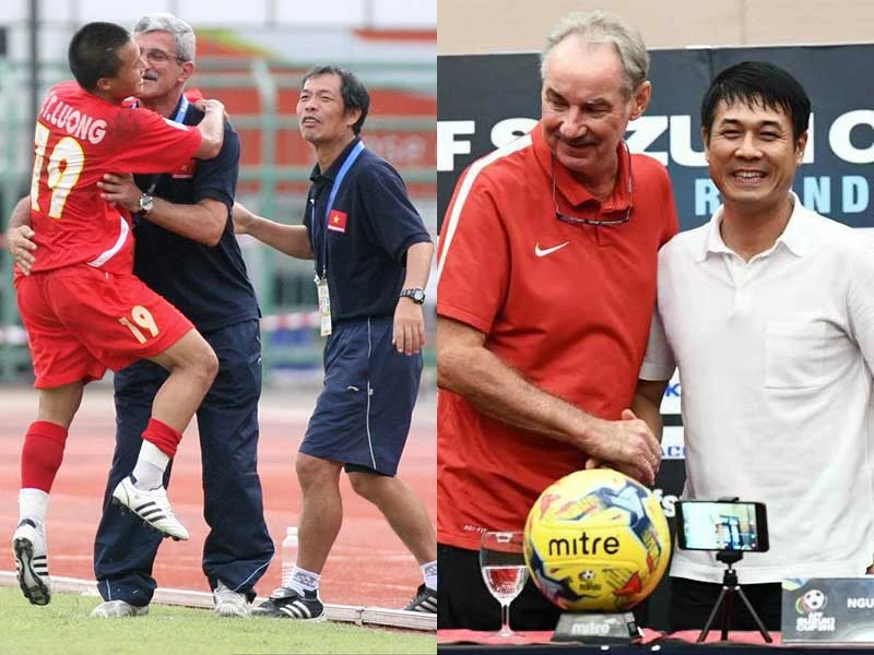 Ông Calisto được xem là bậc thầy về tâm lý gắn với chiếc cúp vô địch AFF 2008 mừng chiến thắng cùng Thành Lương. Ảnh: ANH HÒA Thầy Riedl phải dùng lối đá xấu xí để phá lối chơi của trò Hữu Thắng. Ảnh: AFF NEWS