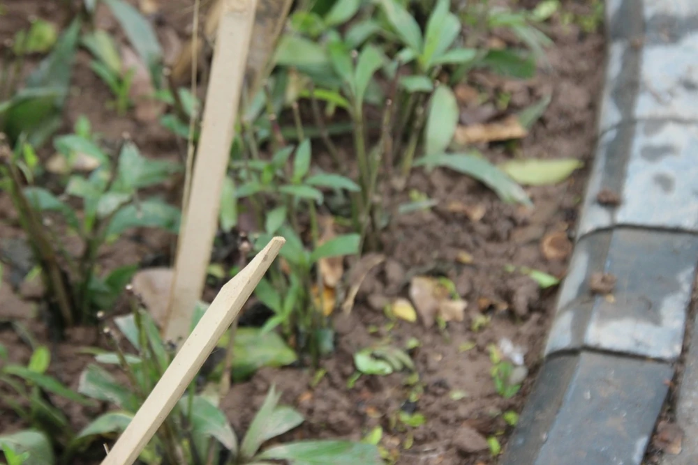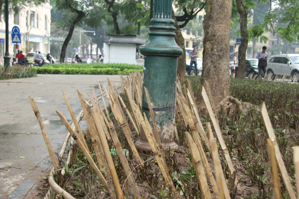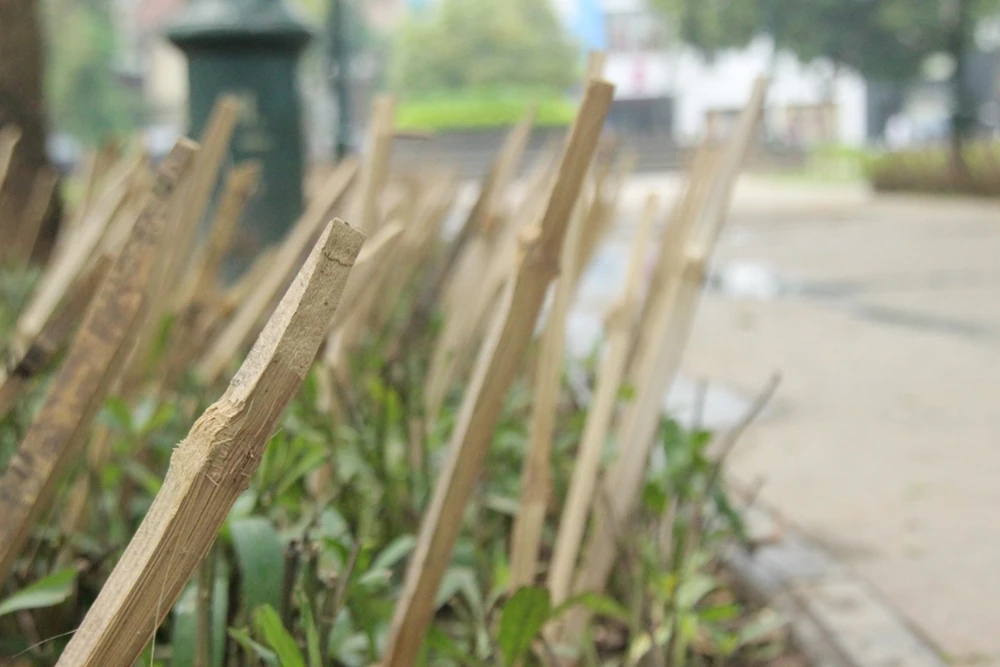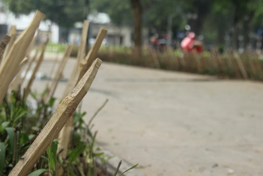 Một công nhân cây xanh tại đây cho hay việc cắm cọc là nhằm ngăn chó của người dân trong khu vực vào phá hoa. Cọc tre được cắm cách đây ít ngày, kể từ khi các cây hoa được trồng mới.