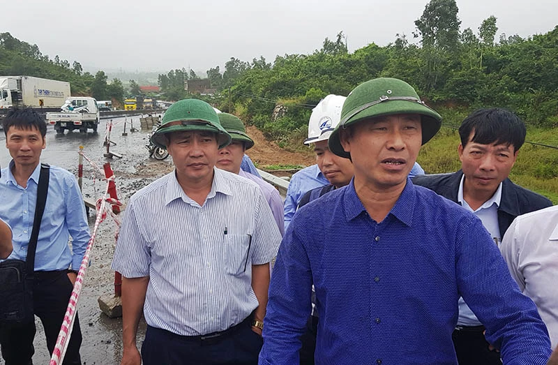 Thứ trưởng Bộ GTVT Lê Đình Thọ (hàng đầu) thị sát tình hình hư hỏng trên quốc lộ 1 đoạn qua tỉnh Phú Yên. Ảnh: TẤN LỘC