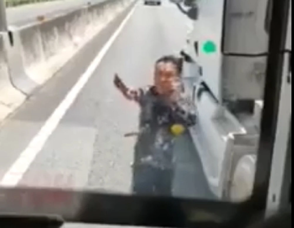 Bức xúc vì bị tạt đầu, tài xế container cầm dao đập bể kính chiếu hậu xe khách rồi bỏ đi. Ảnh cắt từ clip