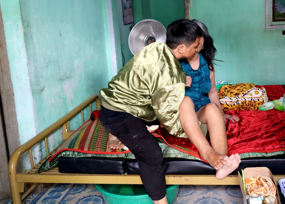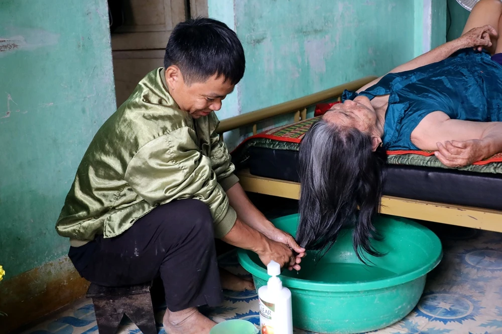 Chúng tôi đến thăm cụ Nguyễn Thị Giỏi trong căn nhà cấp 4 ọp ẹp. Thật xúc động khi thấy con trai của cụ, anh Nguyễn Lộc Thọ đang cẩn thận gội đầu cho mẹ, liền sau đó lại xoa bóp tay chân cho bà, khéo léo nâng đỡ người mẹ ngồi dậy hay nằm xuống giường…