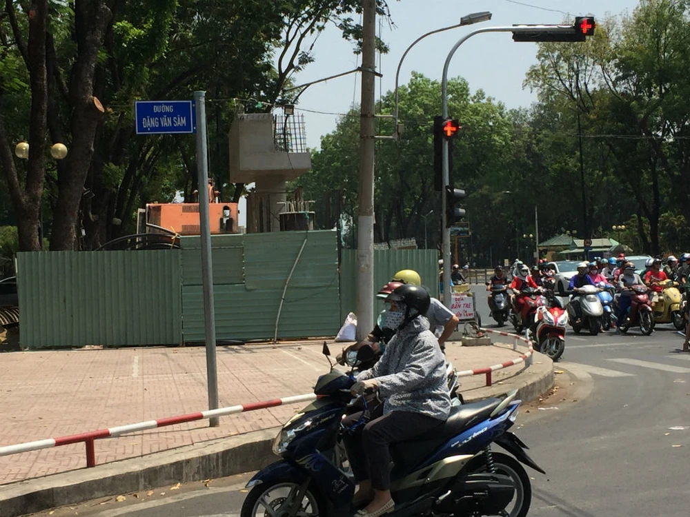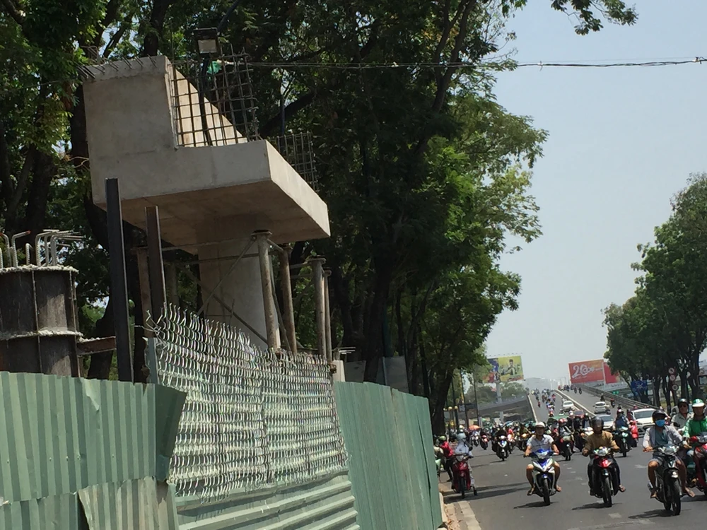 Đến sáng nay, trụ và mũ trụ ở hai bên công viên Gia Định, nơi có đường Hoàng Minh Giám đi bên dưới đã xong. Rạng sáng mai, 26-3 sẽ lao lắp dầm qua hai trụ này nên phải cấm xe