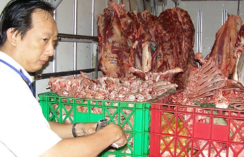 Nhân viên Trạm Thú y Tân Bình kiểm tra thịt bò từ tỉnh đưa vào chợ Phạm Văn Hai. (Ảnh chụp lúc 2 giờ 10 ngày 30-11) Ảnh: TRẦN NGỌC