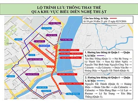 Theo đó, từ 18 giờ 30 đến 21 giờ 15 ngày 2-9 sẽ cấm tất cả loại phương tiện lưu thông trên các tuyến đường Nguyễn Tất Thành (đoạn từ Hoàng Diệu đến cầu Khánh Hội), Tôn Đức Thắng (đoạn từ Công trường Mê Linh đến cầu Khánh Hội), Đồng Khởi (đoạn từ Mạc Thị Bưởi đến Tôn Đức Thắng), Hàm Nghi (đoạn từ Hồ Tùng Mậu đến Tôn Đức Thắng), Nguyễn Huệ (đoạn từ Lê Thánh Tôn đến Tôn Đức Thắng).