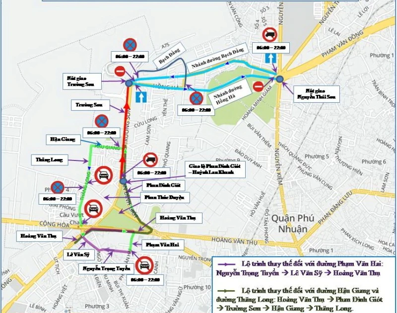 - Đường Phạm Văn Hai (đoạn từ đường Nguyễn Trọng Tuyển đến đường Hoàng Văn Thụ): Cấm các loại ô tô theo hướng từ đường Nguyễn Trọng Tuyển đến đường Hoàng Văn Thụ từ 6 giờ đến 22 giờ.