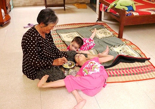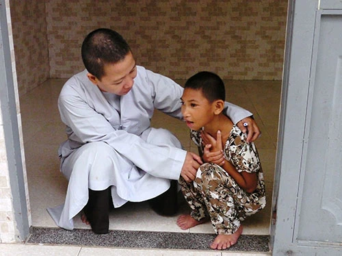 Sư cô Thích Nữ An Sơn bên đứa trẻ khuyết tật tại mái ấm.