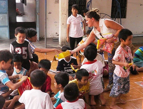 Người nước ngoài thăm và tặng đồ chơi cho các bé.