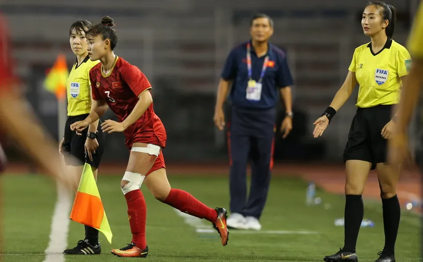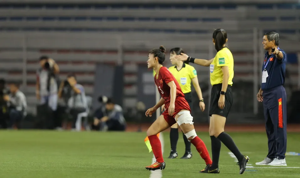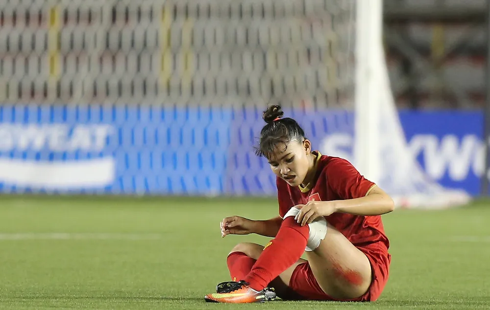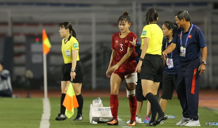 Sau một pha cản phá bóng quyết liệt, trung vệ Chương Thị Kiều không may bị rách một mảng da đùi gây chảy máu nhưng cô gái dân tộc Khmer vẫn kiên cường sát cánh với đồng đội chiến đấu suốt 120 phút để lên ngôi hậu SEA Games 30.