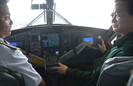 Thủ tướng Nguyễn Tấn Dũng trò chuyện với phi công lái chiếc thủy phi cơ tại căn cứ Cam Ranh