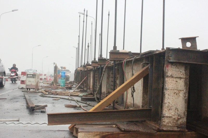 Khu vực cầu bị gẫy do tàu Thành Luân 28 đâm ngày 6-3 đang được sửa chữa