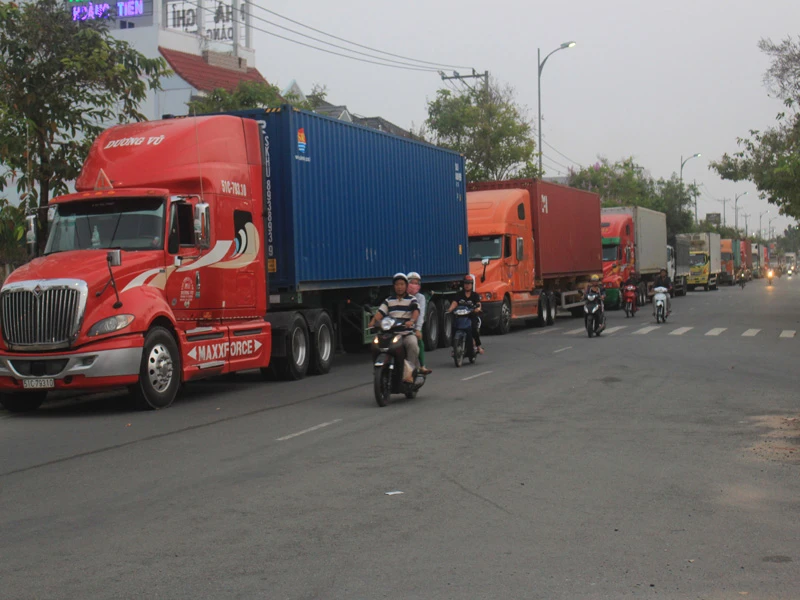 Dòng xe ba trục xếp hàng dài đậu chờ hết giờ cấm để qua cầu.