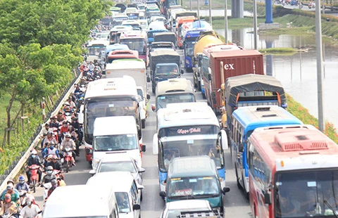 Ùn ứ trên quốc lộ 1 ở cửa ngõ phía tây của TP.HCM (như ảnh) vào các dịp lễ, tết và không xảy ra ở đoạn sắp cấm. Ảnh: MP
