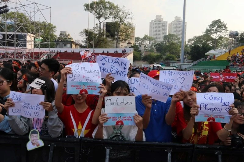 Đó là hình ảnh biển cổ động viên nô nức đến sân Thống Nhất với rất nhiều băng-rôn khẩu hiệu độc, lạ dành cho thần tượng của mình. Phía trong sân, những khẩu hiệu như “Nhiệm vụ của anh là bắt bóng, tại sao anh lại bắt luôn cả trái tim em” của một fan nữ dành cho thủ thành Bùi Tiến Dũng khiến ai nhìn thấy cũng bật cười. Còn rất nhiều khẩu hiệu thân thương khác mà các CĐV giành tặng cho những Công Phượng, Xuân Trường, Đức Chinh, Quang Hải,… và những người hùng U-23 Việt Nam.