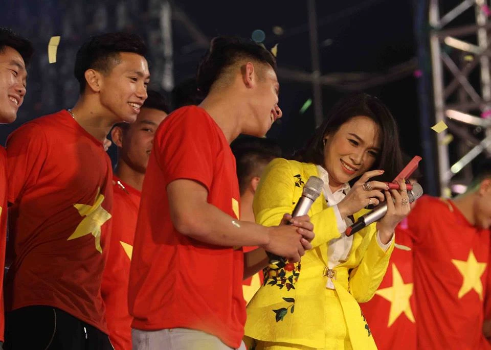 Cuối chương trình là hình ảnh Công Phượng, Hồng Duy thay mặt U-23 Việt Nam tặng son cho ca sĩ Mỹ Tâm. Ngay lập tức, Mỹ Tâm đã dùng thỏi son này làm đẹp ngay trên sân khấu.