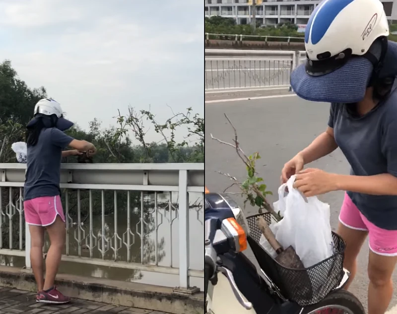 Trao đổi với PLO, chủ tài khoản Facebook Mung Trinh, người trực đăng clip trên cho biết: Khoảng 6 giờ 30 sáng 28-9, trên đường đi làm đến chân cầu Cả Cấm 2 (đường Nguyễn Lương Bằng, quận 7, TP.HCM), anh bắt gặp một người phụ nữ đi xe máy, trong trang phục thể thao, mặt đeo khẩu trang đang loay hoay bứng các cây hoa giấy được trồng trên lan can cầu.