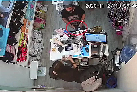 Một tay dùng túi che chắn, một tay lấy đi điện thoại của nhân viên. Ảnh cắt từ clip