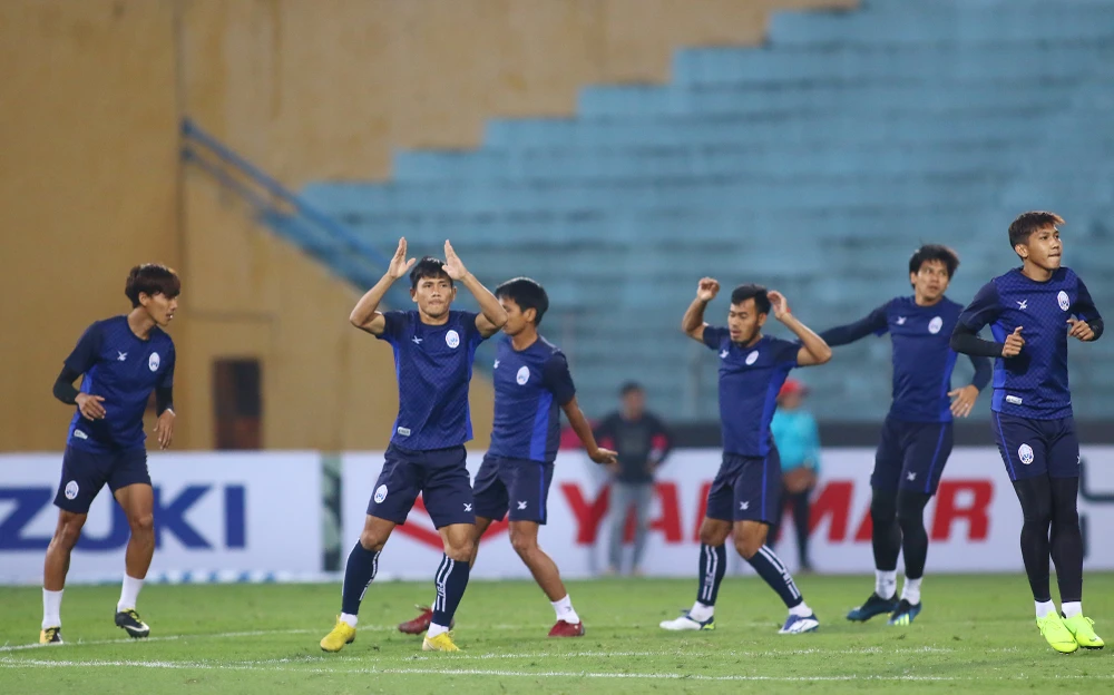 Sau 15 phút khởi động nghiêm túc, đại diện tuyển Campuchia yêu cầu các phóng viên rời khỏi sân để tập kín cho 90 phút đầy khó khăn ở Hàng Đẫy đêm 24-11.