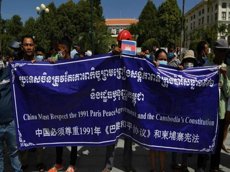 Người biểu tình cầm biểu ngữ với dòng chữ: "Trung Quốc phải tôn trọng Hiệp định Hòa bình Paris 1991 và Hiến pháp của Campuchia". Ảnh: AFP