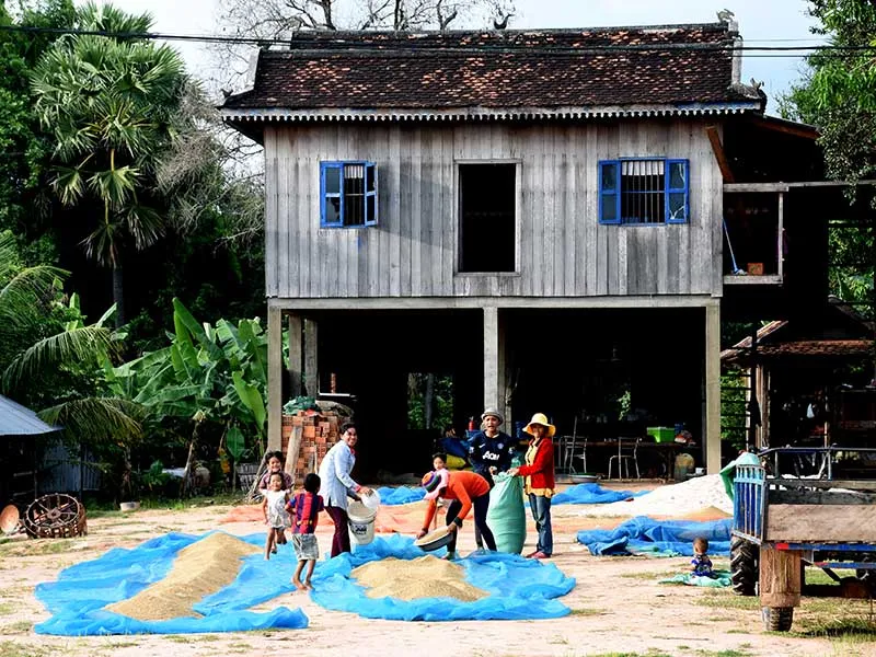Một ngôi nhà sàn nằm giữa những cây thốt nốt, sau lưng là những ngọn núi xa mờ và một cánh đồng xanh thẫm với những con trâu, bò thơ thẩn là hình ảnh quen thuộc, đặc trưng và đẹp như tranh của nông thôn Campuchia. Càng nhìn ta càng cảm thấy vẻ đẹp của ngôi nhà sàn vì phong cách kiến trúc của nó đậm đà văn hóa Khmer, văn hóa ở châu Á. Đó là những ngôi nhà nằm trên những trụ cột cao trên 3 m. Đa số là cọc gỗ nhưng ngày nay một số người khá giả đã thay thế bằng cột bê tông cốt sắt cho nó bền, chắc hơn.